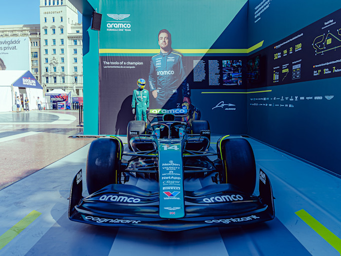 We're bringing Fernando's Aston Martin Aramco garage to central Barcelona. At the heart of the F1 Fan Village, can be found an immersive experience that surrounds fans in the sights and sounds of F1 and provides the opportunity to get up close to the Aston Martin Aramco F1 show car, learn more about Fernando's remarkable career and discover some of Fernando's racing essentials, including helmet and race suit.
